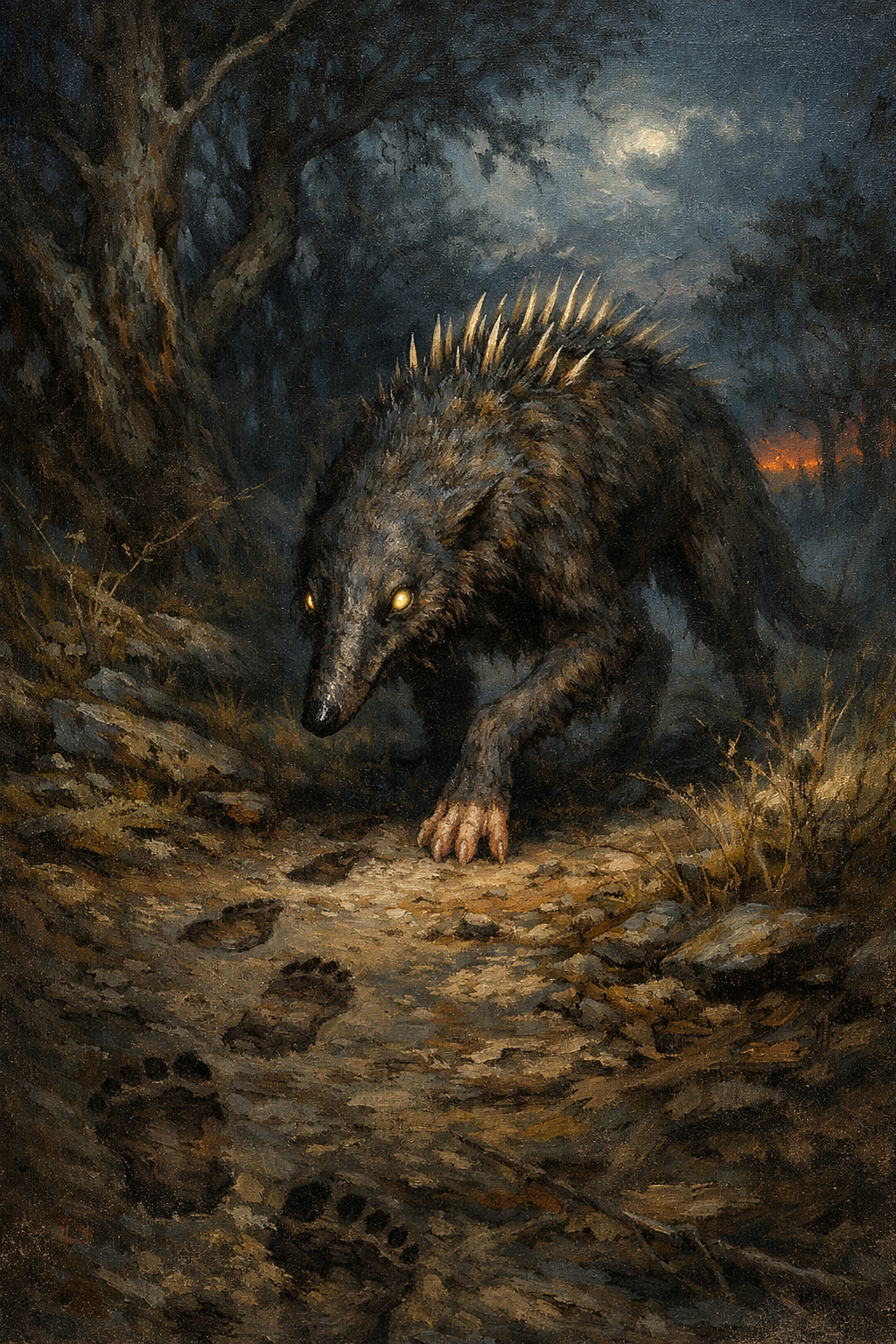 The Eer-moonan is a rare and unsettling chimera whispered of in frontier lore—a lean canine predator with the spined snout of an echidna and disturbingly human feet. Moving silently through scrublands and shadowed forests, these creatures stalk prey with patient intelligence, often hunting in small packs that coordinate ambushes with uncanny precision. Their presence is most often discovered by the strange tracks they leave behind: animal prints suddenly giving way to the barefoot steps of something disturbingly human.