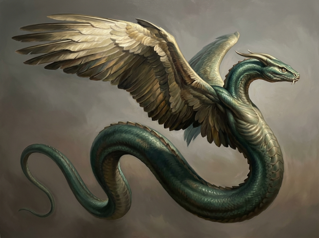 The Amphiptere is a sleek, serpentine dragon with a body covered in iridescent scales that shimmer from emerald green to bronze in sunlight. Stretching up to 20 feet in length, it lacks legs, slithering through the air like a ribbon caught in the wind. Its wings, broad and feathered like those of a giant raptor, extend from powerful shoulder joints just behind the neck. The head is elongated, featuring a hooked beak, slitted eyes that glow like molten gold, and a crown of fine quills or crests used in threat displays. The tail ends in a barbed or spade-like tip used for aerial maneuvering or whipping prey.