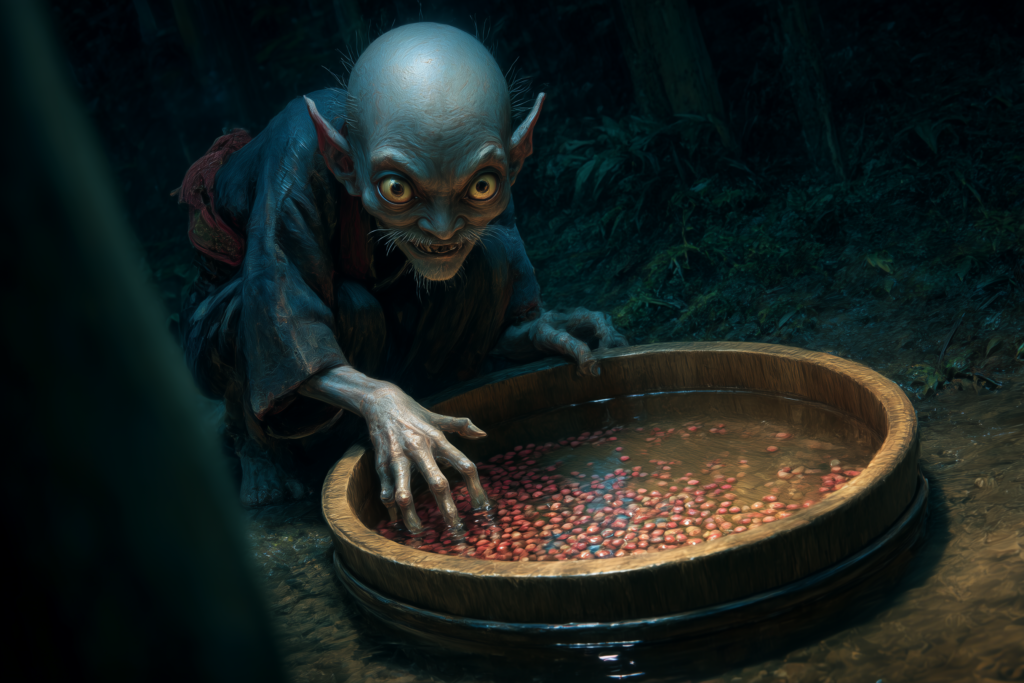 Azuki Arai — a curious yokai of Japanese myth whose haunting shoki-shoki bean-washing call echoes from riverbanks and mountain streams, luring the unwary with the promise of red beans and the whisper of danger.
