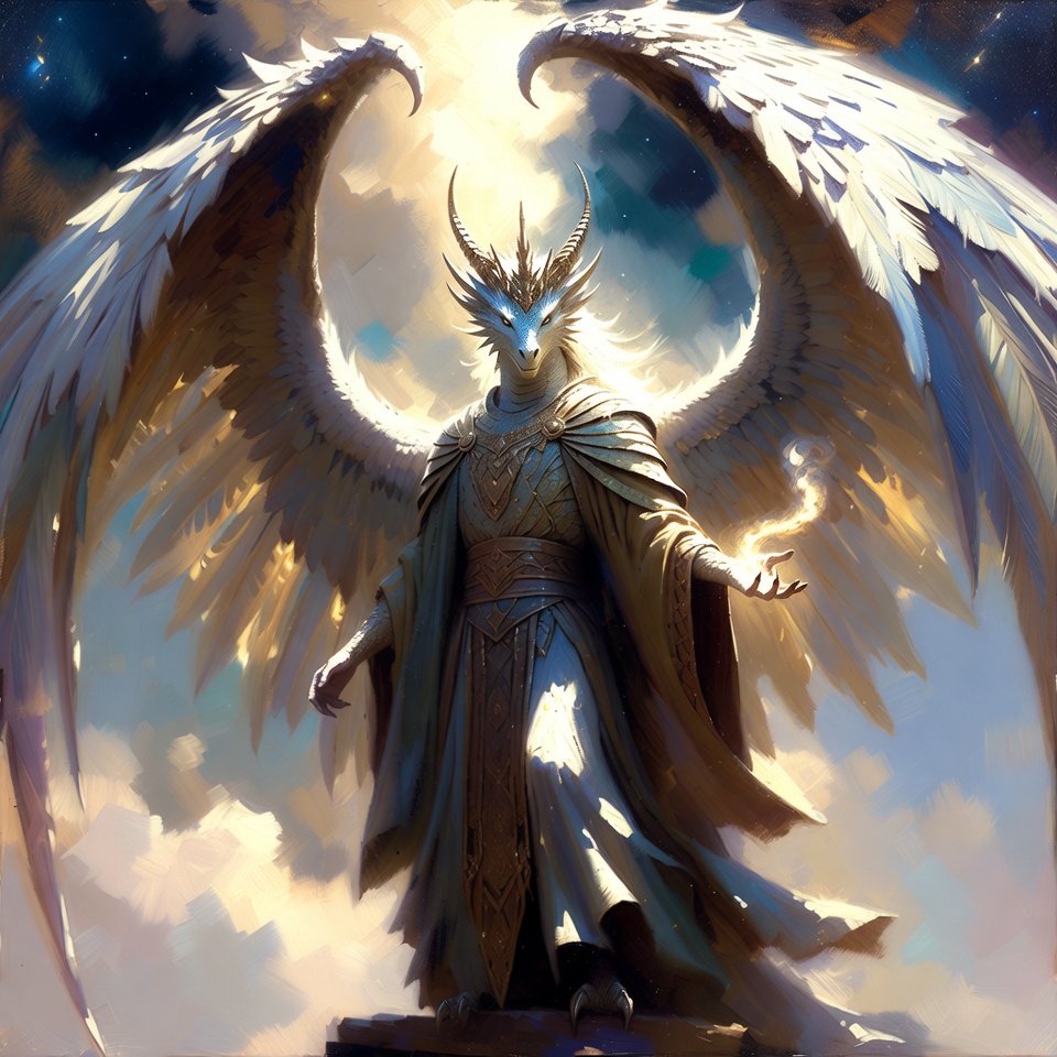 A Draconal is a majestic fusion of serpent, humanoid, and dragon, towering with broad, powerful wings, scaled limbs, a long sinuous tail, and a regal crown of horns; its draconic visage radiates timeless wisdom and celestial authority that can be mistaken for a true dragon at a glance.