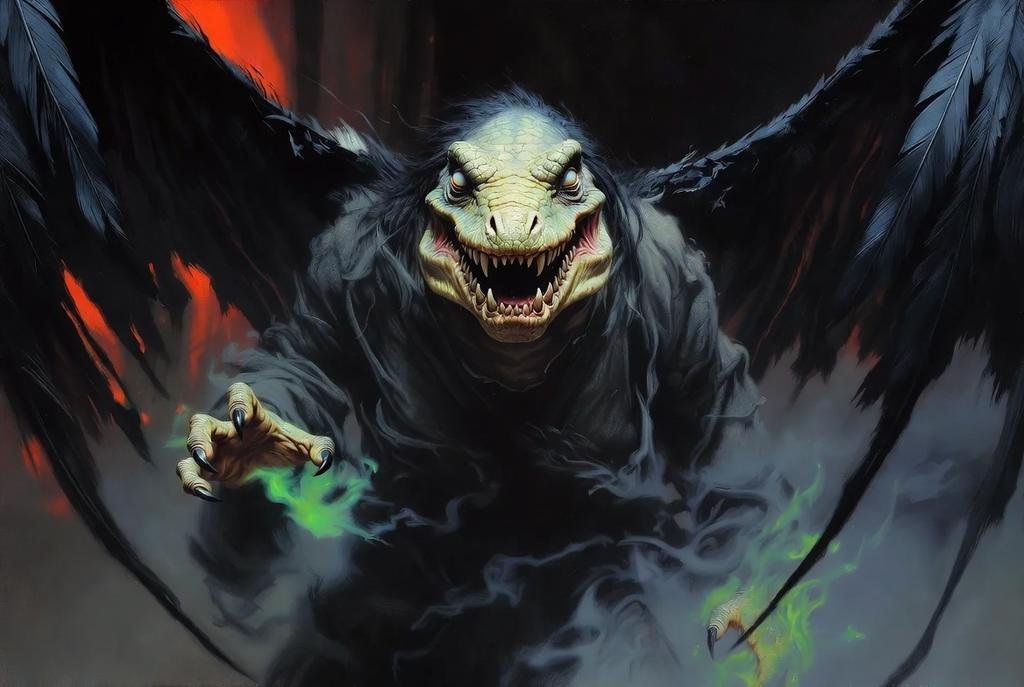 The Barregon is a grotesque, winged humanoid, roughly the height of a small man but with a disproportionately large head and a cavernous, crocodilian mouth. Small, dead-white eyes glimmer from sickly mustard-colored scales, while its stunted body is shrouded in damp, immaculate robes. Only its long, dexterous, clawed hands are visible, glowing with a throbbing green aura. Every movement conveys predatory grace and unnatural menace.