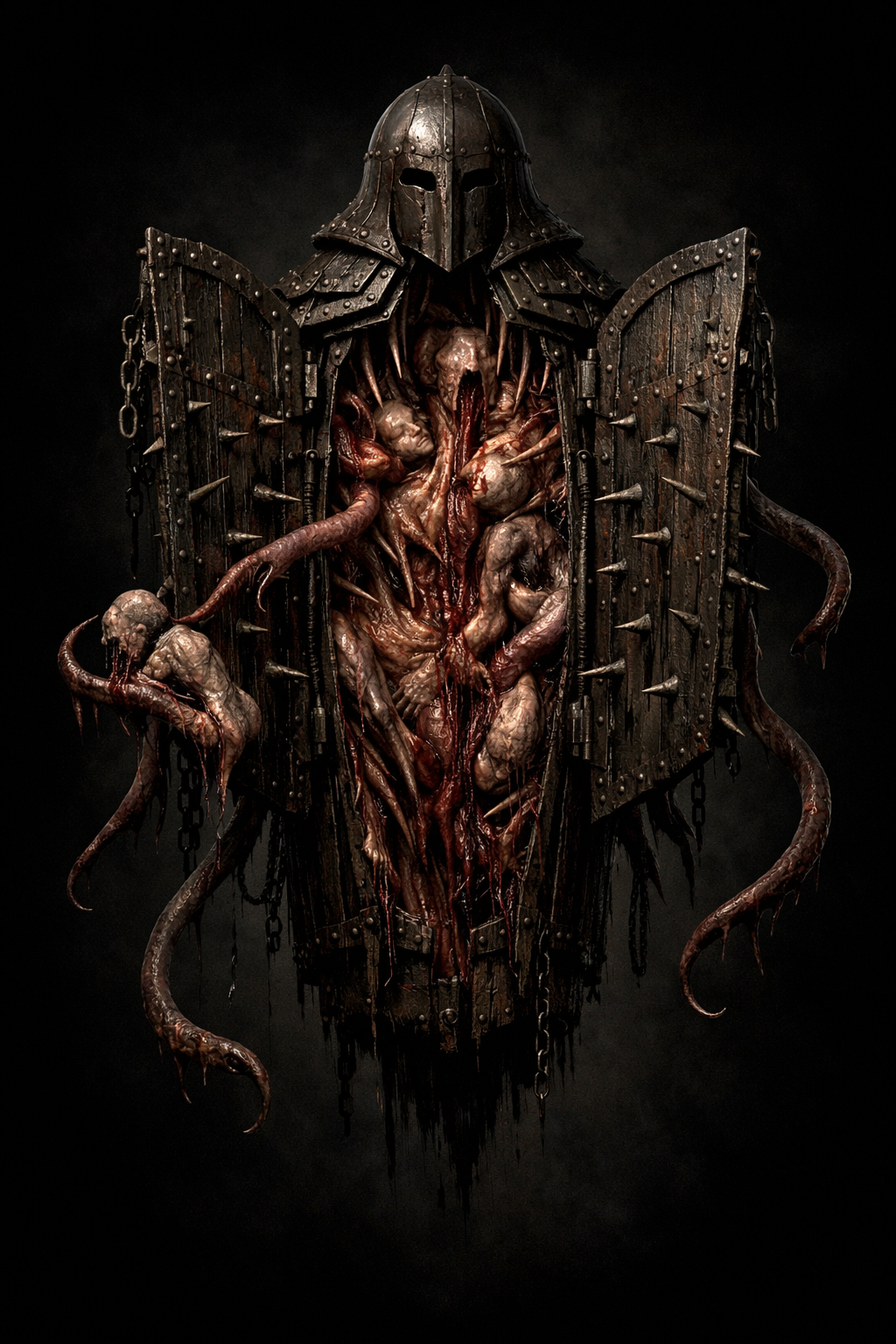 A Termagant resembles a massive iron maiden torn open and given dreadful life. The metal shell hovers weightlessly in the air, its rusted panels studded with spikes, hooks, and chains. From the gaping cavity within spills a writhing mass of pale flesh—tangled limbs, barbed tentacles, and raw sinew that twitch with unsettling vitality.