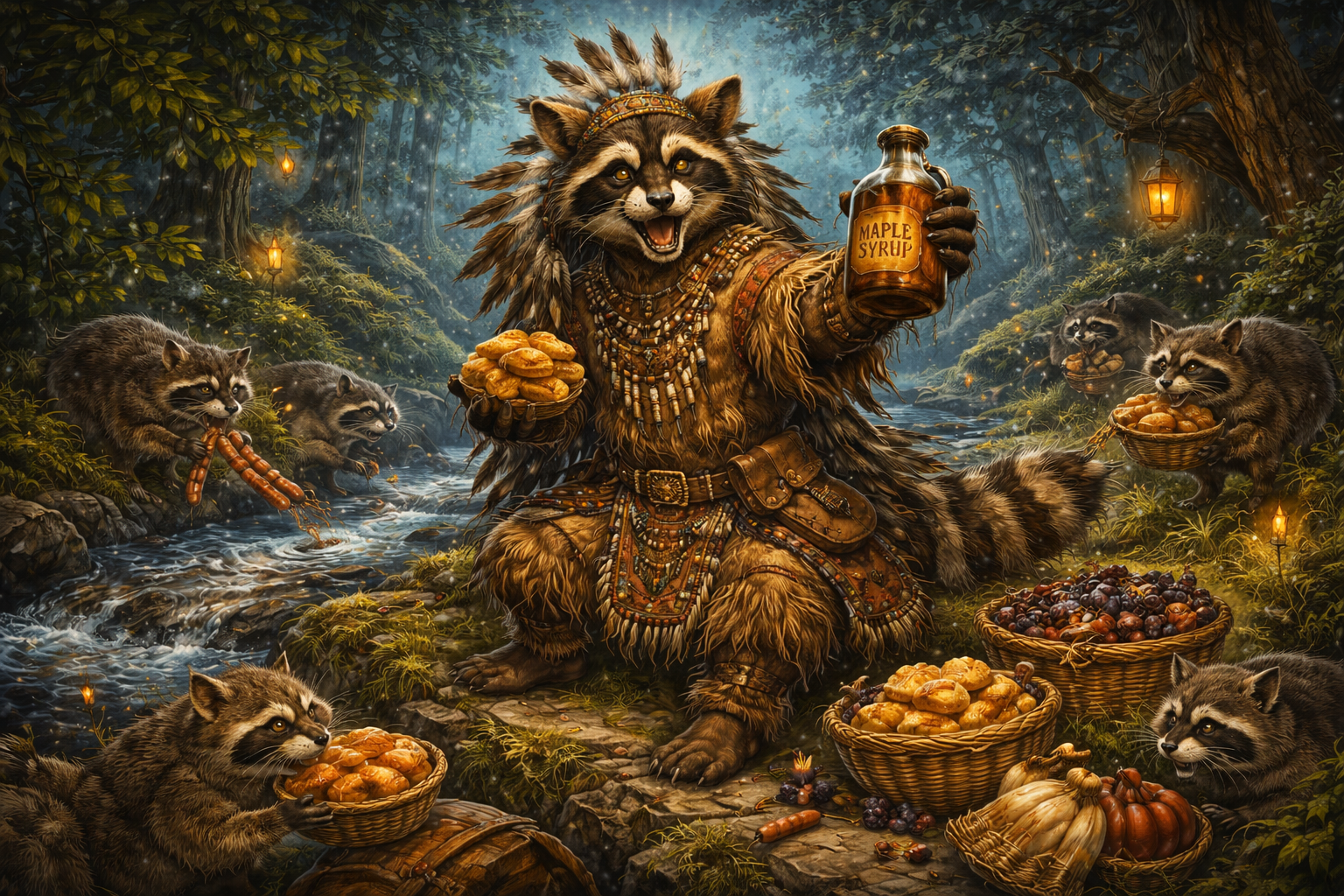 He most often appears as a raccoon—small, quick-fingered, and bright-eyed with restless intent. Yet behind that simple form is a spirit who speaks, schemes, and meddles in the affairs of mortals and spirits alike. Unlike greater tricksters such as Coyote or Raven, Azeban is neither reliably cunning nor meaningfully wise.